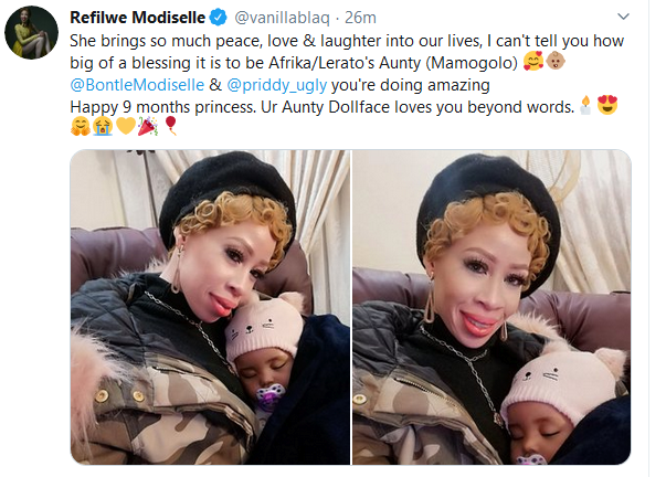 Refilwe also sang the praises of Afrikas parents, “@BontleModiselle & @priddy_ugly you’re doing amazing. Happy 9 months princess. Ur Aunty Dollface loves you beyond words.”