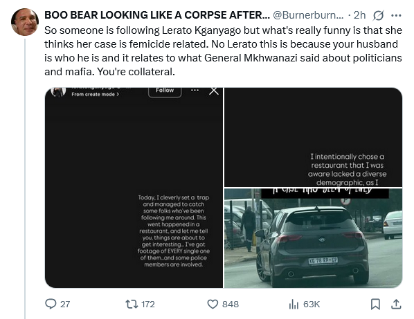 “So someone is following Lerato Kganyago but what’s really funny is that she thinks her case is femicide related. No Lerato this is because your husband is who he is and it relates to what General Mkhwanazi said about politicians and mafia. You’re collateral,” they said.