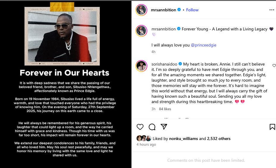 Sorisha Naidoo: “My heart is broken, Annie. I still canβt believe it. Iβm so deeply grateful to have met Edgie through you, and for all the amazing moments we shared together. Edgieβs light, laughter, and style brought so much joy to every room, and those memories will stay with me forever. Itβs hard to imagine this world without that energy, but I will always carry the gift of having known such a beautiful soul. Sending you all my love and strength during this heartbreaking time. ππ.”