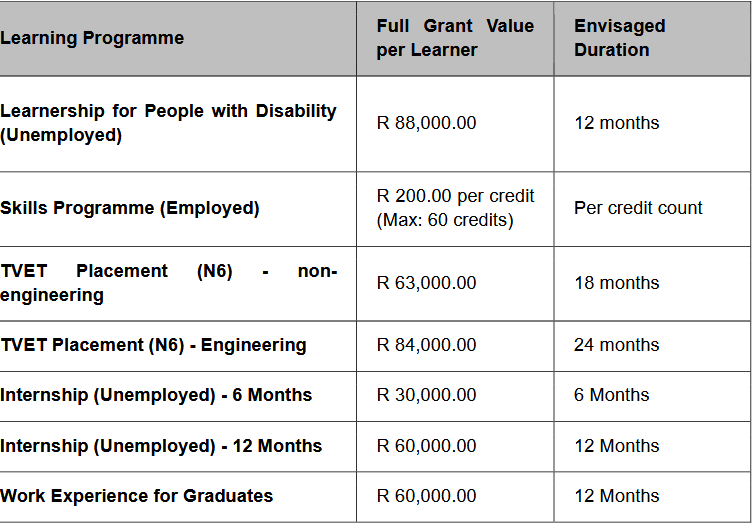 Available Learning Programmes & Grant Values