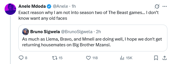 Exact reason why I am not into season two of The Beast games… I don’t know want any old faces,” Anele said.