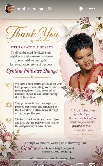 “We extend our heartfelt gratitude for your love, prayers, comforting words, visits, messages, flowers and every act of kindness shown to our family during this difficult time. Your presence brought strength to us, peace to our hearts, and reminded us that God’s love is often shown through caring people like you. We thank the Lord for each one of you and pray that He richly blesses you for the compassion you have shown,” the Shange family said.